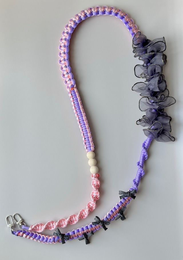 連結部分で外したりつけたりできるので、シーンに合わせて多様な使い方ができます。組み合わせで7通りの長さで使用可能です。 【アレンジの例】 ・短いフリル部分だけでハンドストラップとして使用 ・フリル部分を外し、全体の長さを短くして使用 ・全てつけてコートの上から着用 ・フリルの位置を端から真ん中へ移動させてより目立たせる ★色: ピンク×グレー ★各パーツごとの長さ:36cm/18cm/85cm 全長:約140cm(一直線に伸ばした状態での金具の端からもう一方の金具の端までのサイズ) 7芯4mmのパラコードの芯にさまざまな技法で編み模様を施しています。 ・モニターにより写真の色が異なって見える場合があります。 ・採寸には若干の誤差がある場合があります。 ・パラコード端は焼いて処理しています。 ・パラコード・金具は丈夫なものを使用していますが、強く引っ張ると破損の原因になります。 ・到着から1週間以上経過後の破損等へのご対応はいたしかねます。 以上ご理解いただきご購入いただけると幸いです。